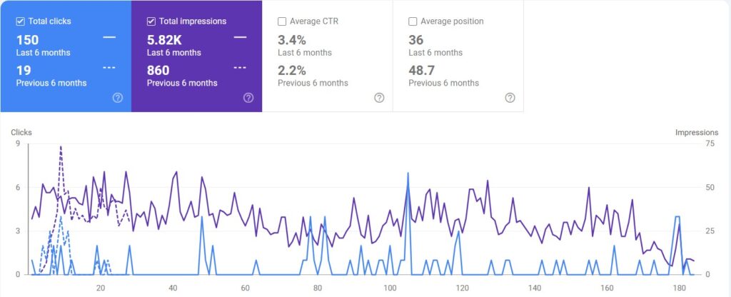 6-Month SEO Growth: Clicks Jump from 19 to 150, Impressions from 860 to 5.82K