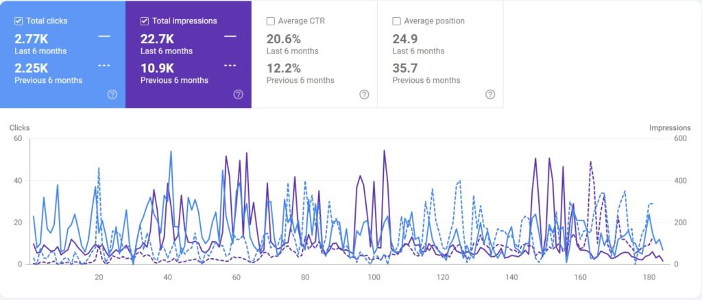 In the past 6 months, SEO performance strengthened significantly. Clicks increased from 2.25K to 2.77K, while impressions grew from 10.9K to 22.7K. CTR jumped from 12.2% to 20.6%, and rankings improved from position 35.7 to 24.9. This growth reflects the impact of consistent SEO optimization and improved visibility in search results.